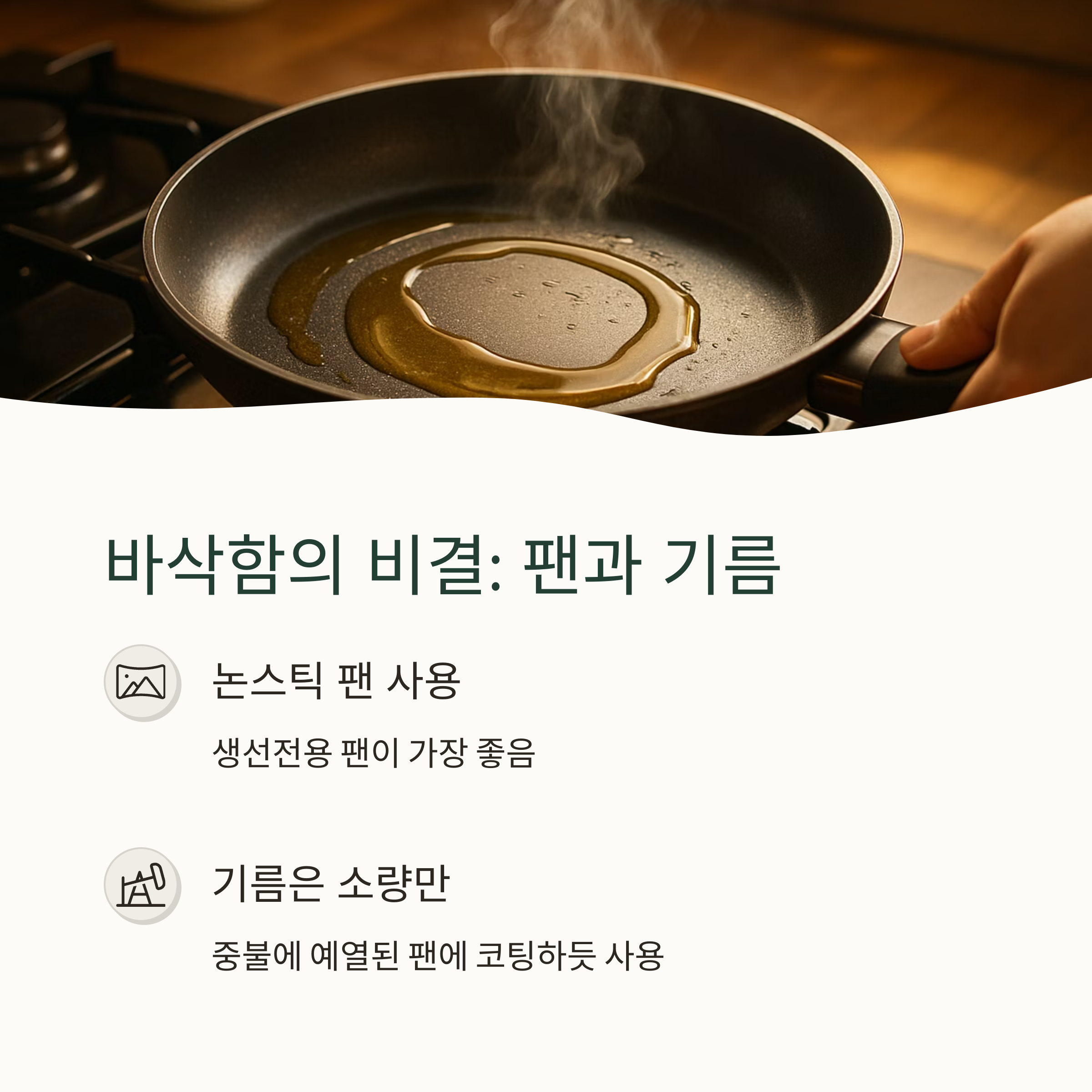 기름은 많이 두르기보다 중불에 예열된 팬에 약간만 뿌려 코팅하듯 사용하는 것이 바삭하게 익히는 핵심입니다.