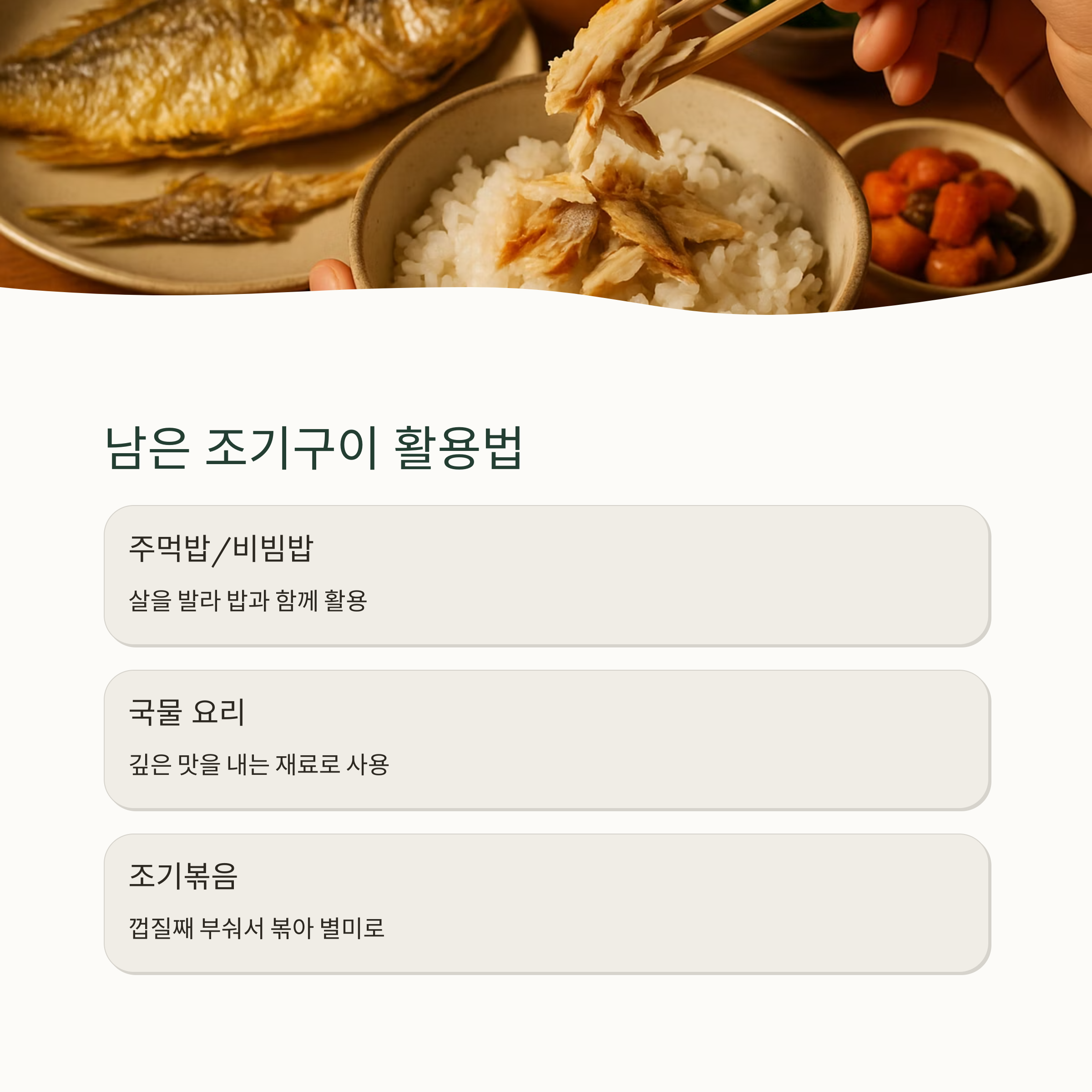 남은 조기구이는 살을 발라내어 주먹밥이나 비빔밥에 활용할 수 있습니다.